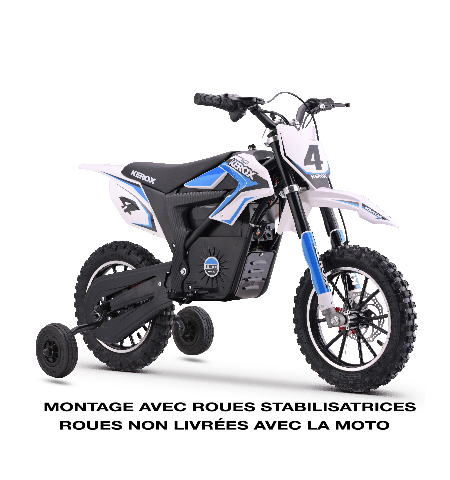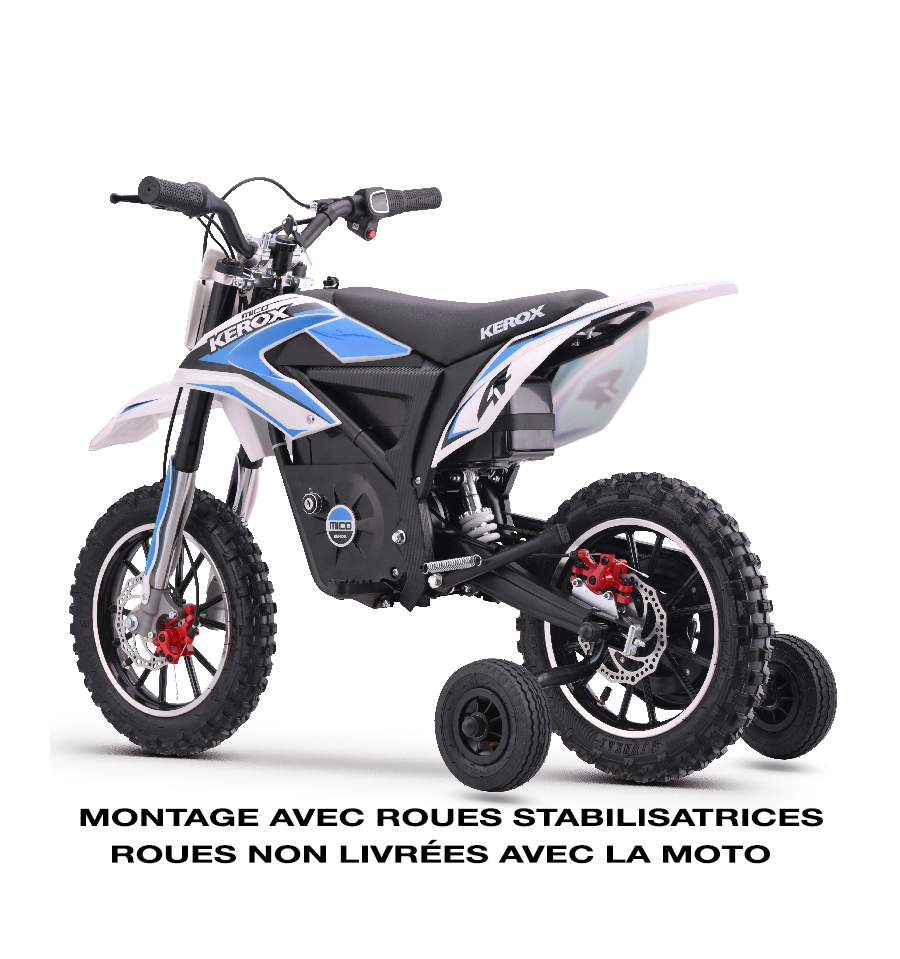 Vous cherchez une moto électrique enfant alliant expérience d'apprentissage, sécurité et divertissement ? Lebonquad vous présente la pocket cross électrique E-MICO, créée par la marque Française Kerox. Proposée dans une gamme de couleurs attrayantes (orange, bleu, vert, rouge et orange), cette pocket cross offre aux enfants l'occasion d'acquérir les compétences de conduite de base tout en s'amusant, éliminant toute appréhension au guidon grâce à ses équipements soigneusement conçus que nous détaillerons ci-dessous. La E-Mico peut être équipée d'un Kit Stabilisateur pour nos plus petits encore un peu instables sur 2 roues.