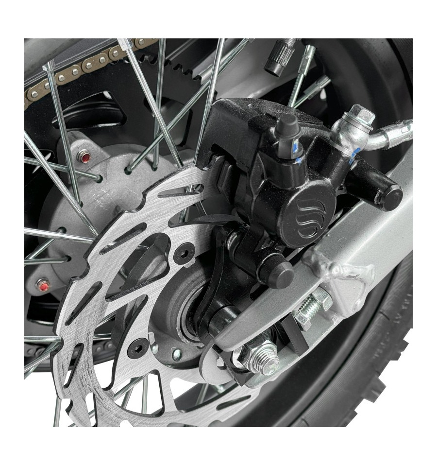 Conçue pour offrir un confort optimal, la moto est équipée d’une suspension avant à fourche inversée hydraulique et d’une suspension arrière hydraulique pour absorber les chocs et garantir une conduite fluide même sur des terrains accidentés. Les freins à disque hydrauliques avant et arrière assurent une sécurité renforcée pour des arrêts rapides et contrôlés.
